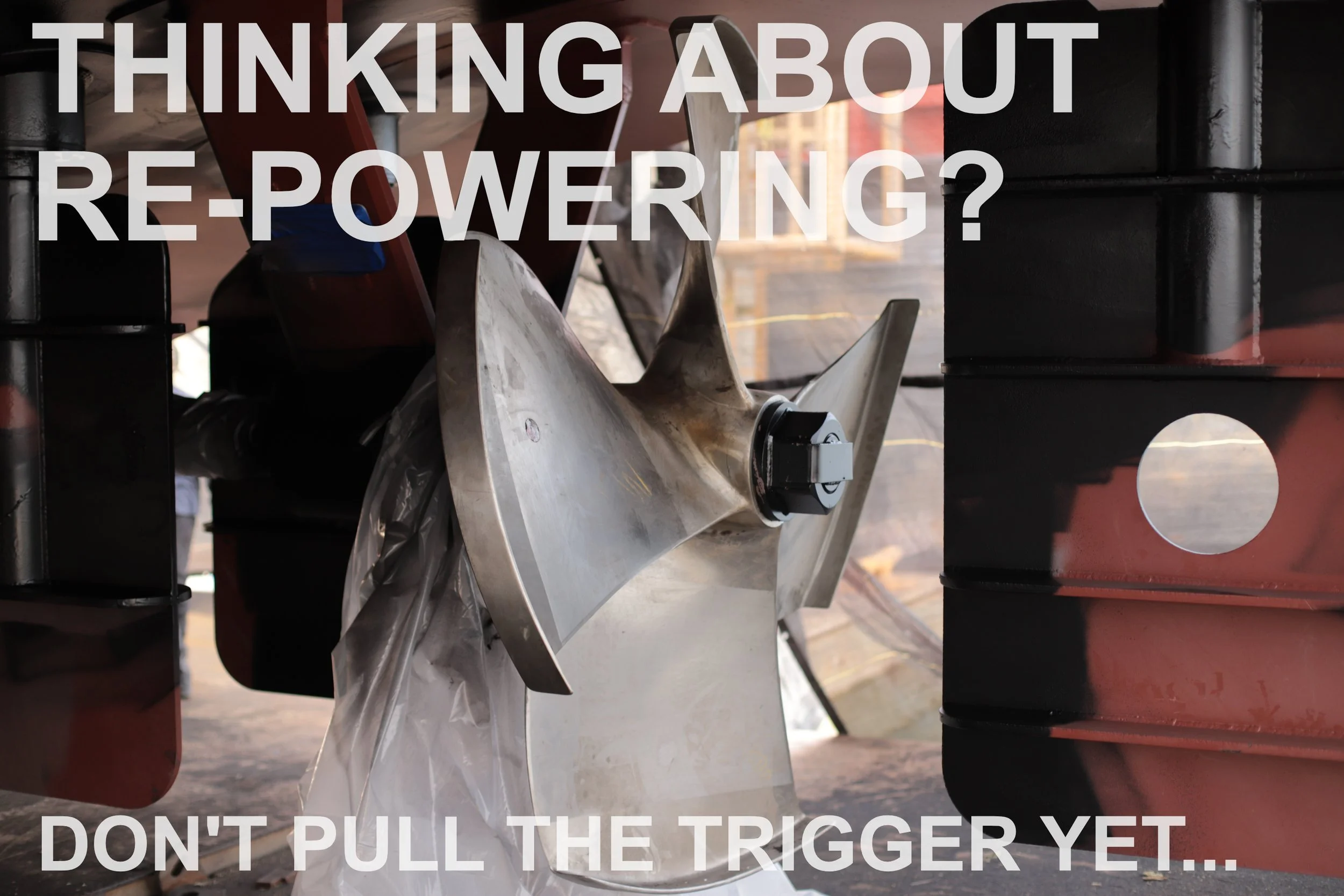And here's another question: is a re-power even necessary? Are you looking for more thrust? Perhaps you should look into the Edge. Inland push boats are seeing massive gains in thrust and maneuverability while reducing vibration and noise. And they're a heck of a lot less costly than new engines + props.